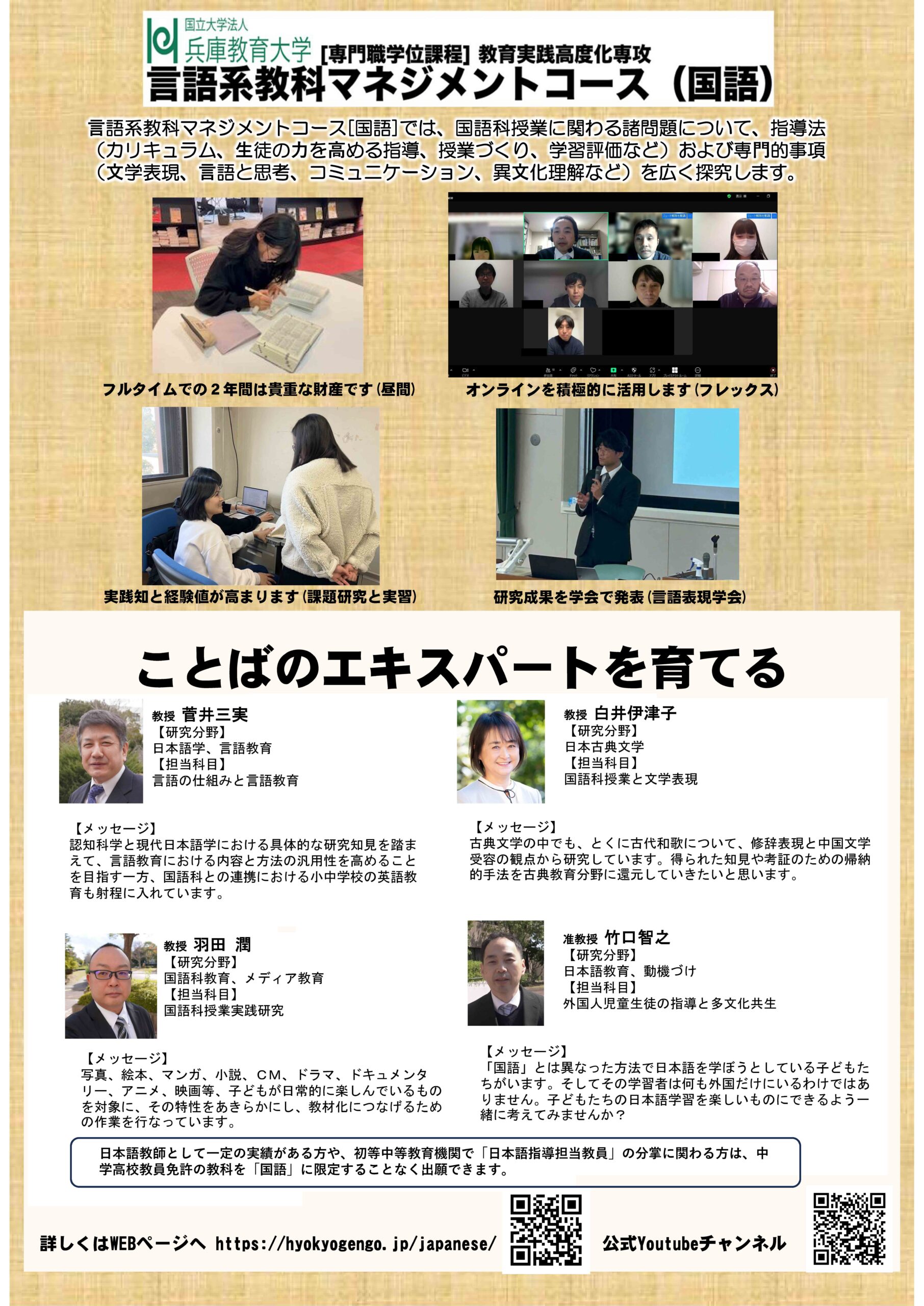 そのことを達成するため、<ことばの教育>に関わる諸問題について、指導法(カリキュラム·シラバス、生徒の資質·能力を高める指導、授業づくり、学習評価、言語習得など)及び専門的事項(言語表現、文学表現、言語構造、言語文化、言語教育、コミュニケーション、異文化理解など)を幅広く探究できるカリキュラムを編成しています。